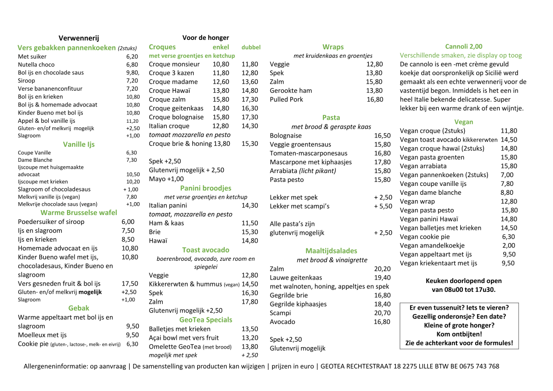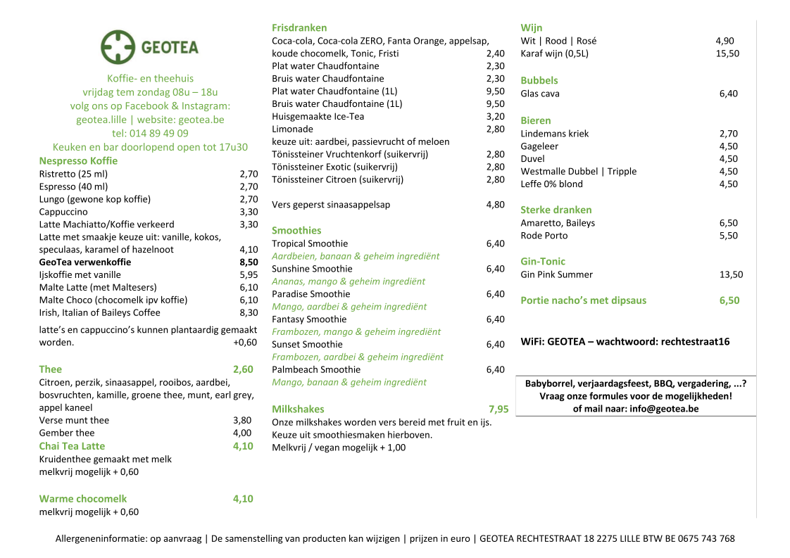 In conclusion, the menu at Geotea Koffie- & Theehuis leaves a warm and lasting impression, especially for tea lovers seeking comforting, well-prepared drinks in a cozy setting. The selection feels carefully curated rather than overwhelming, with each item reflecting quality and attention to flavor. Among the highlights, the Chai stands out as a memorable choice, offering a rich, aromatic blend that feels both soothing and indulgent. The menu overall strikes a pleasant balance between classic favorites and specialty teas, making it easy for guests to find something familiar or try something new. From a reviewer’s perspective, the menu succeeds in delivering a charming tea house experience, where simple offerings are elevated by thoughtful preparation and a welcoming atmosphere, making it a place worth revisiting for a relaxing drink and a quiet moment.